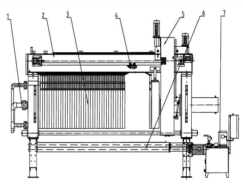 隔膜式壓濾機主要由框架系統(tǒng)、液壓系統(tǒng)、濾板濾布系統(tǒng)組成。
